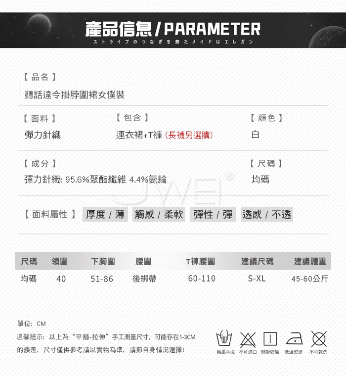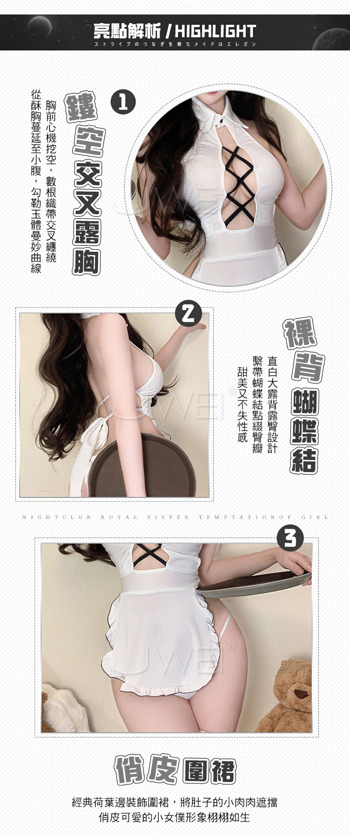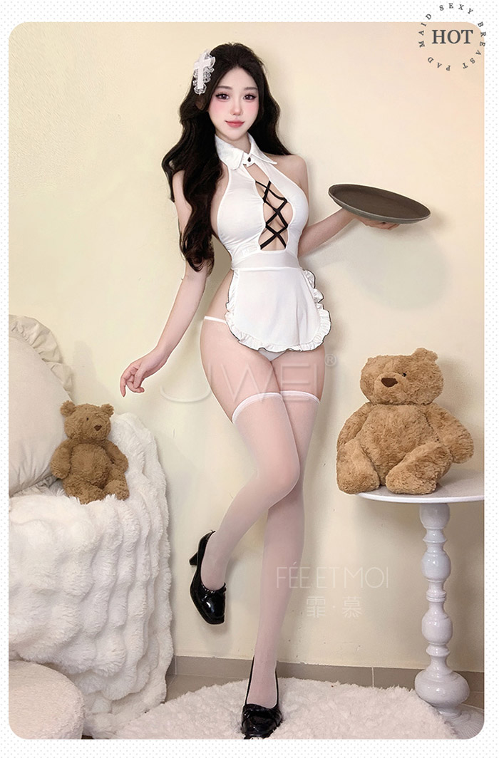 ►您現在的位置:首頁>聽話達令.性感鏤空交叉露胸美背掛脖圍裙女僕套裝【連衣裙+T褲】