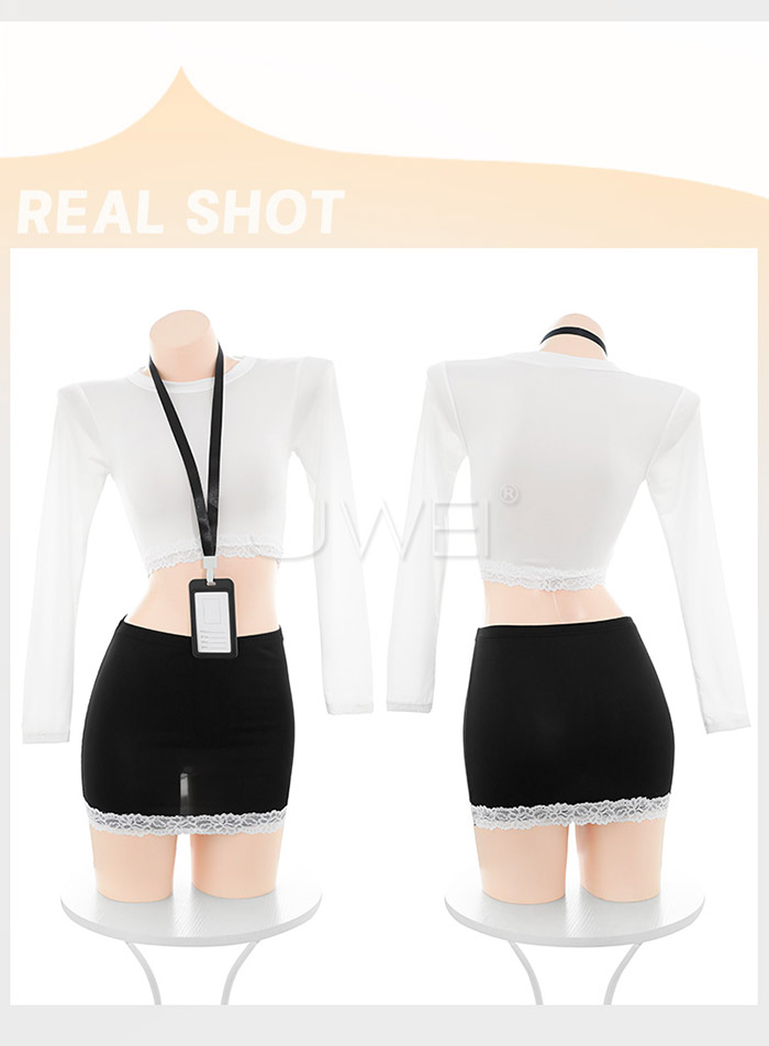 職場佳麗.撩撥暗慾腰腹雙邊蕾絲秘書套裝【上衣+工牌+包臀裙】