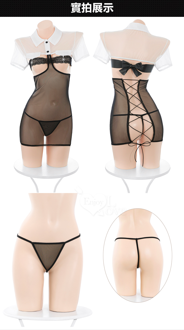 情趣睡衣!立領挖空爆乳蕾絲後綁帶性感薄紗透視連身裙三件組
