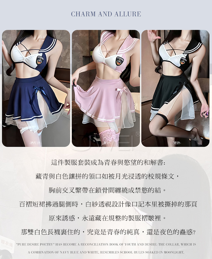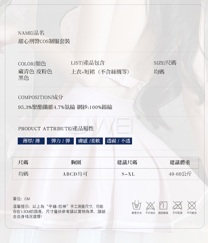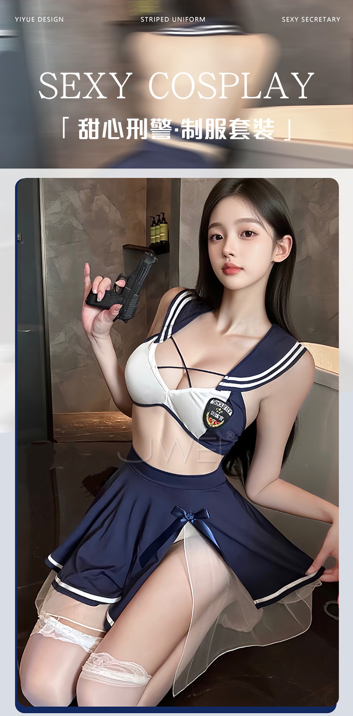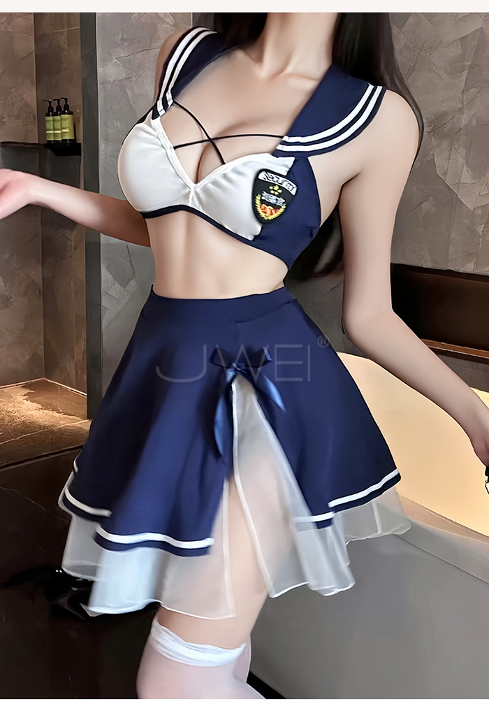 首頁>甜心刑警.胸前交叉繫帶清純百褶透視白紗COS制服套裝【上衣+短裙-藍+白】