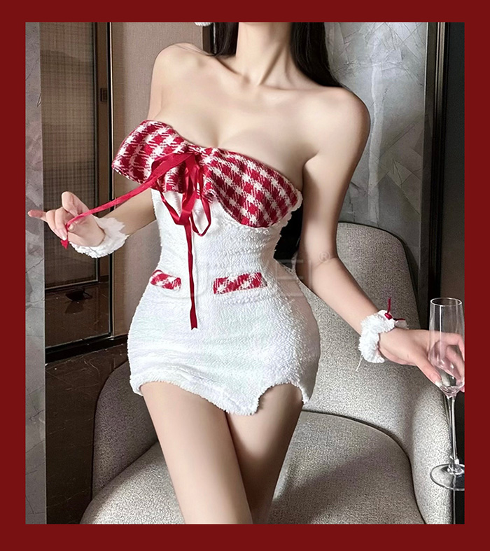 ►您現在的位置:首頁>夢夜覆雪.紅白格紋平口裹胸白色毛絨修身包臀連身裙套裝【帽子+連身裙+手環】