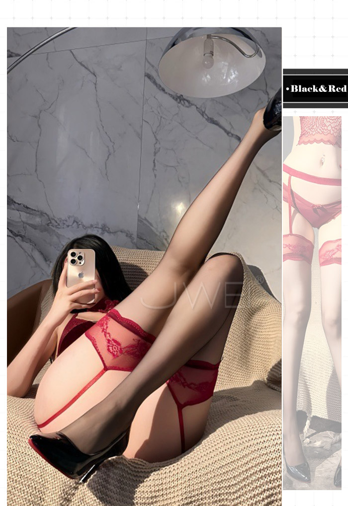 魂牽夢縈.御姐風蕾絲吊帶一體絲襪【紅吊帶+黑絲】